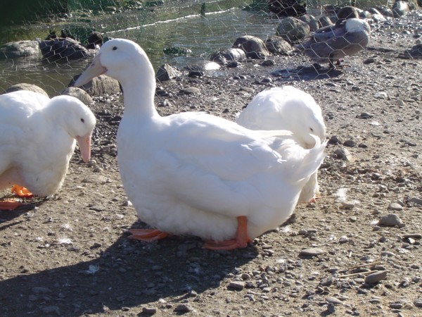 C'est un canard au corps rectangulaire, port horizantale , volumineux,aux plumage entiérement blanc pur